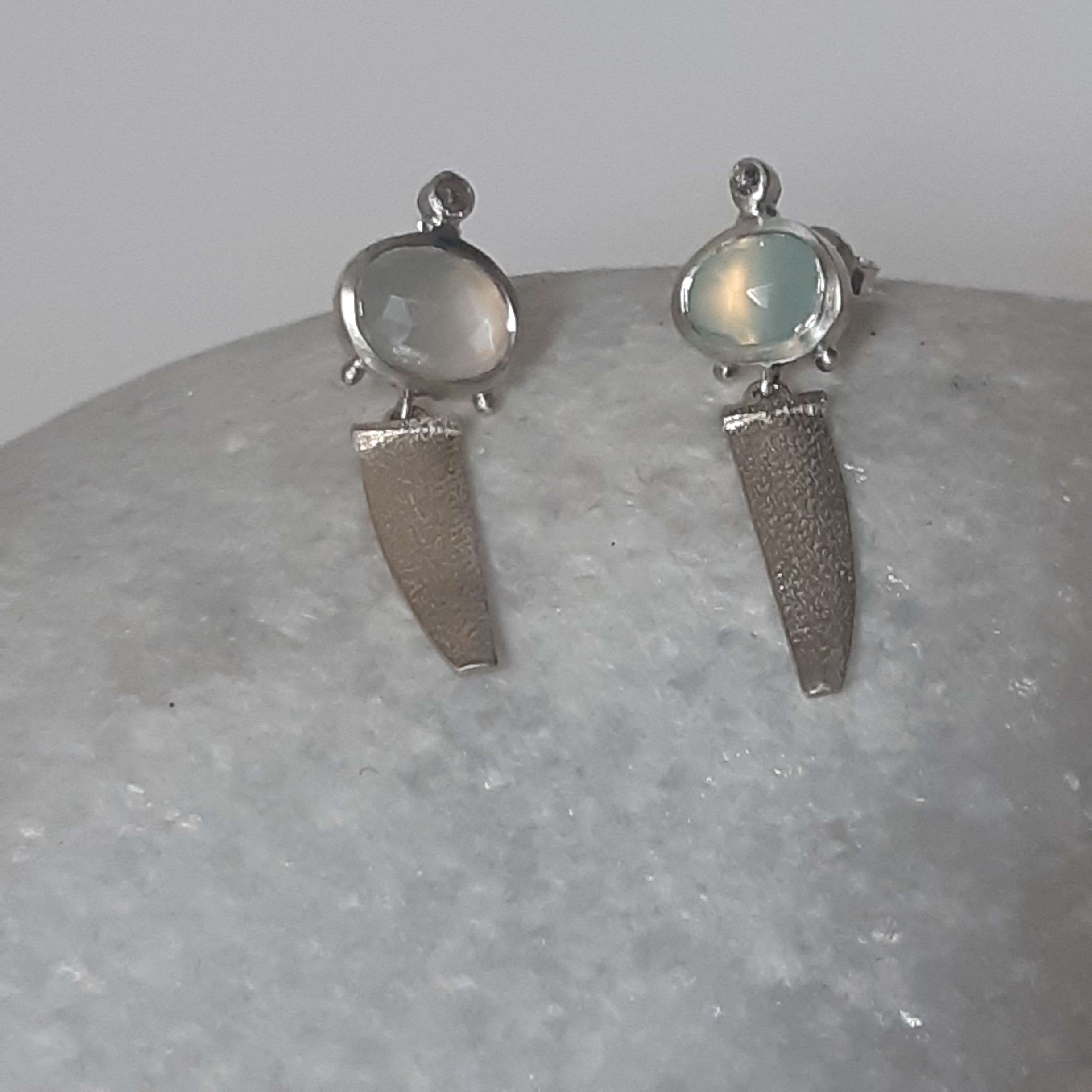 Boucles d’oreilles, avec pierre Calcédoine, aux jolis reflets verts pâles, et petits diamants, et pendants argent