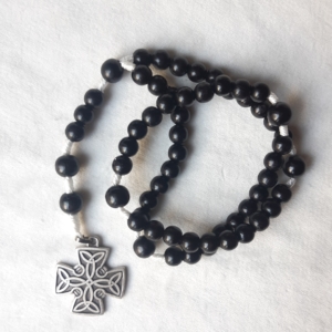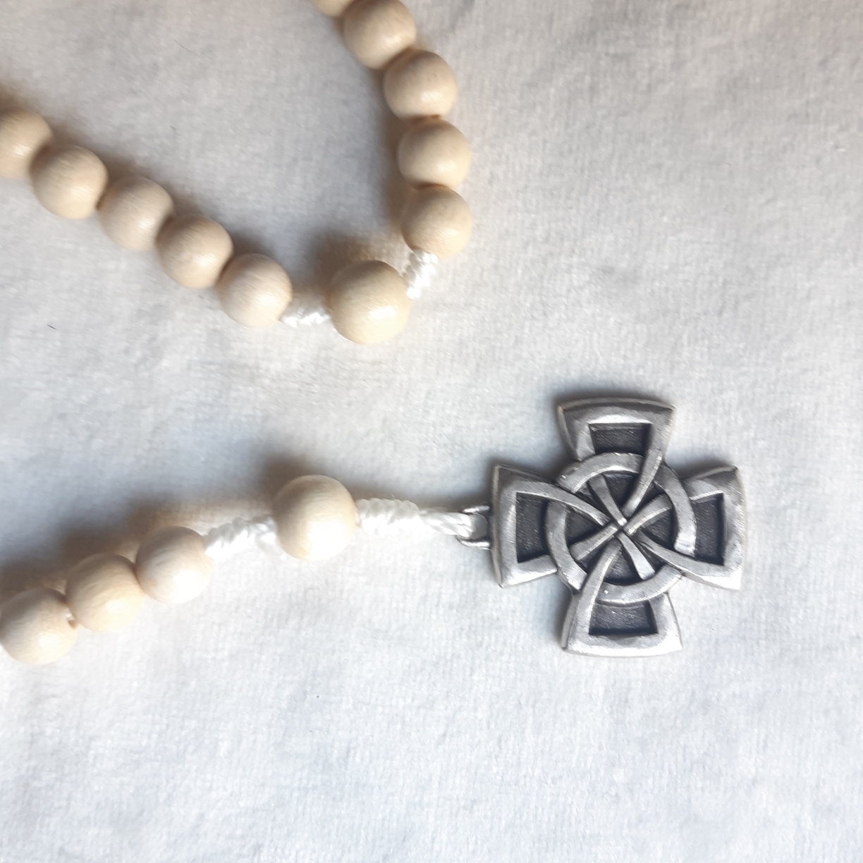 Chapelet en bois blanc, grains ronds 6 mm, croix grecque celtique métallique.