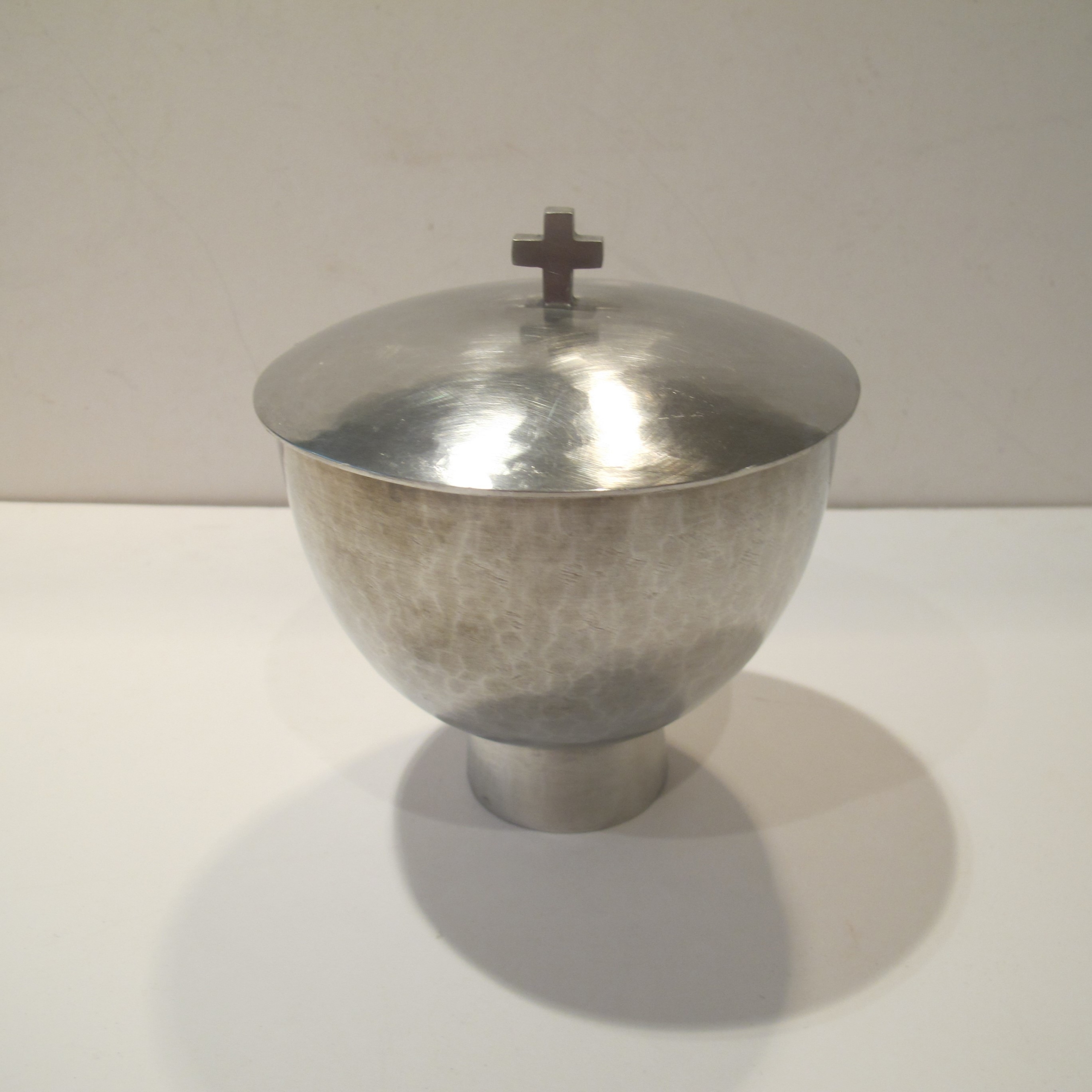Ciboire en dinanderie d’étain alimentaire, réalisé par notre dinandier.