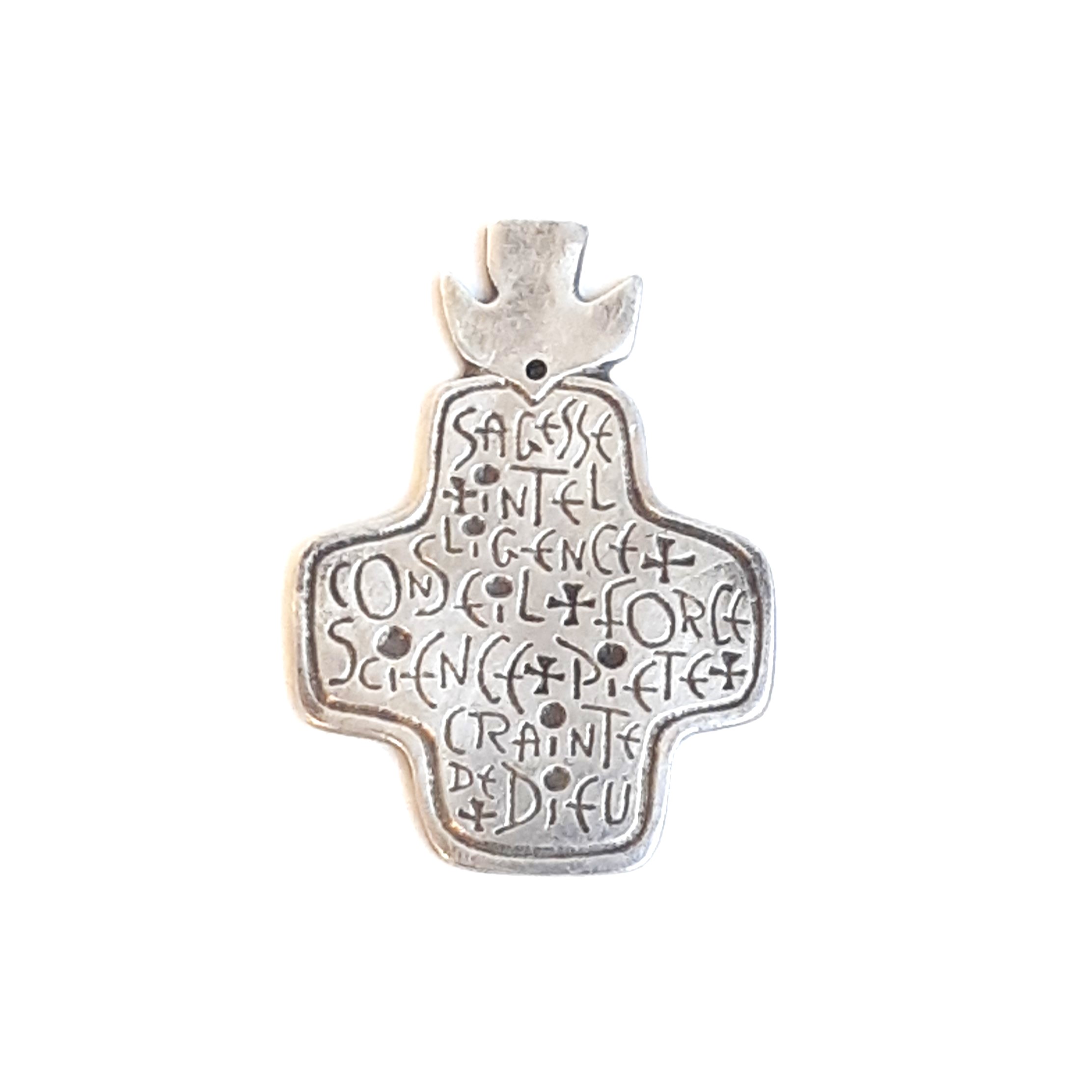 Croix étain à suspendre, avec colombe de l’Esprit Saint et ses 7 dons – Référence 003