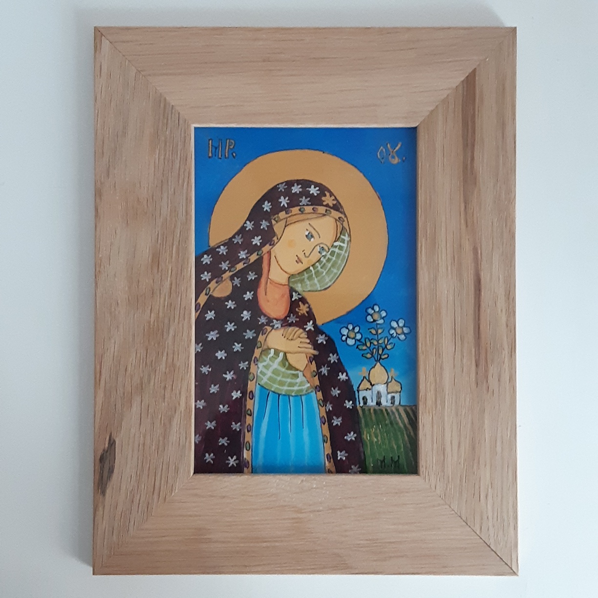 Ce tableau de la vierge orante, en prières, sera parfait comme cadeau de naissance, ou une communion. Le fixé sous verre est une technique de peinture artisanale à l’arrière d’une vitre.